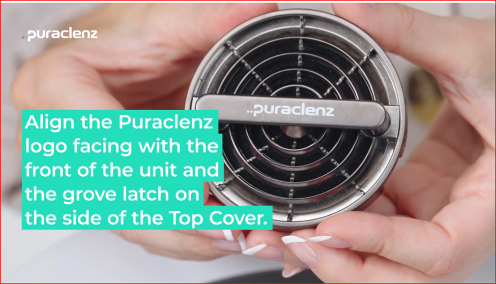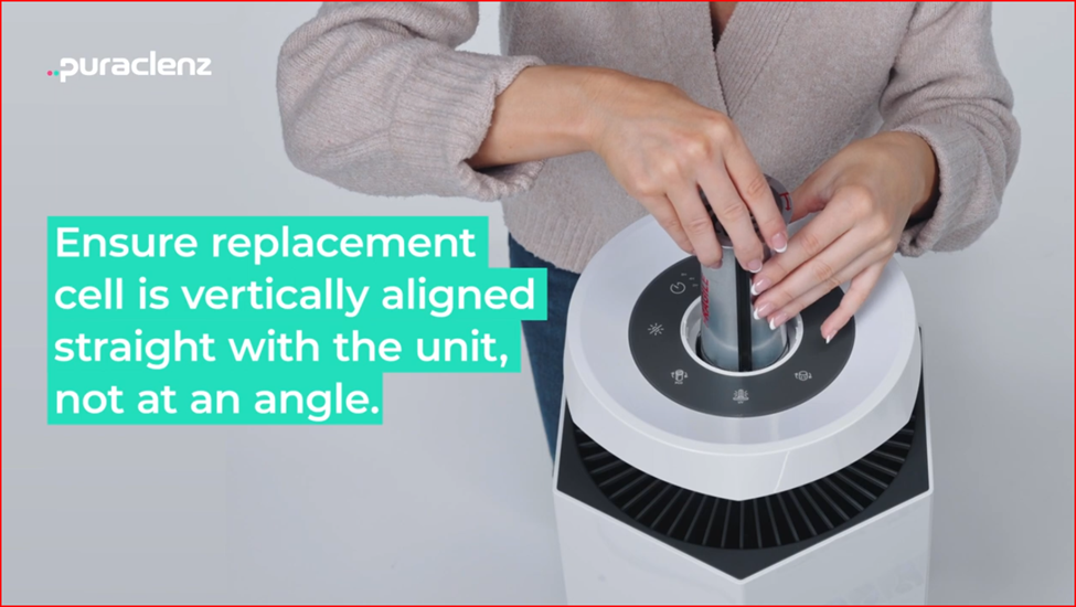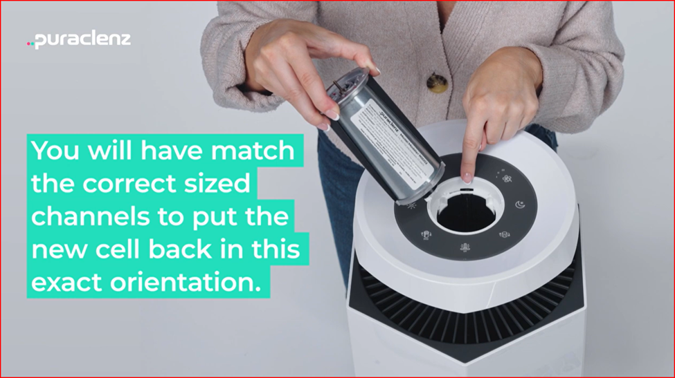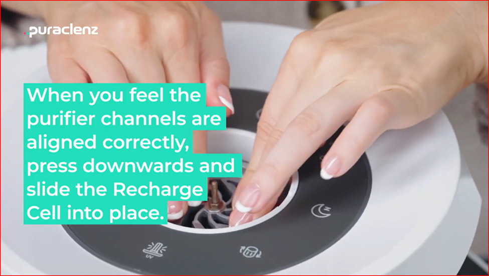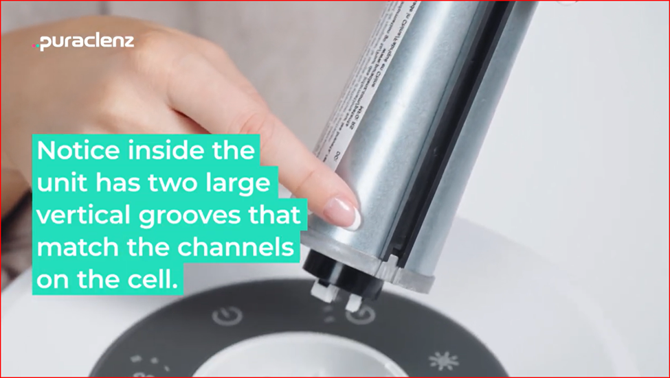 7. Slide the new cell into the purifier by aligning the two vertical grooves on the unit to the corresponding matching channels on the Recharge Cell.