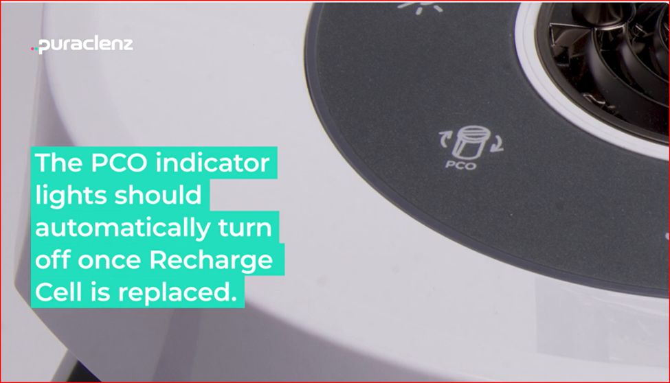 The PCO replacement indicator light should remain off during normal operation. A flashing light means the top cover is not fully engaged. A yellow light means the Recharge Cell needs to be replaced soon, and a red light means it has stopped working and must be replaced.